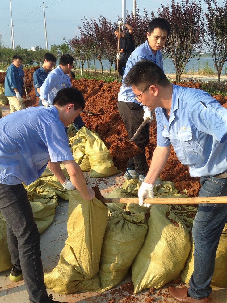 721日16:30到22日凌晨2:30,30人隊伍連續10小時奮戰,從頭頂烈日到披星戴月,裝填2000個沙土袋,碼起100米防洪堤,是連夜一次性完成指定任務的唯一企業隊伍。8月10日14:30到17:30,20人隊伍連續3小時奮戰,頭頂烈日汗流浹背,裝填600個沙石袋,如期完成指定任務。