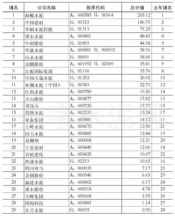 5月7日,中國水泥協會公布2015年中國水泥上市公司綜合實力排名。海螺水泥、中國建材、華潤水泥控股依然位列前三甲,前十強還有:冀東水泥、中材股份、華新水泥、山水水泥、金隅股份、臺泥國際集團和中國天瑞水泥,亞泥(中國)緊隨其后,位列第11位。